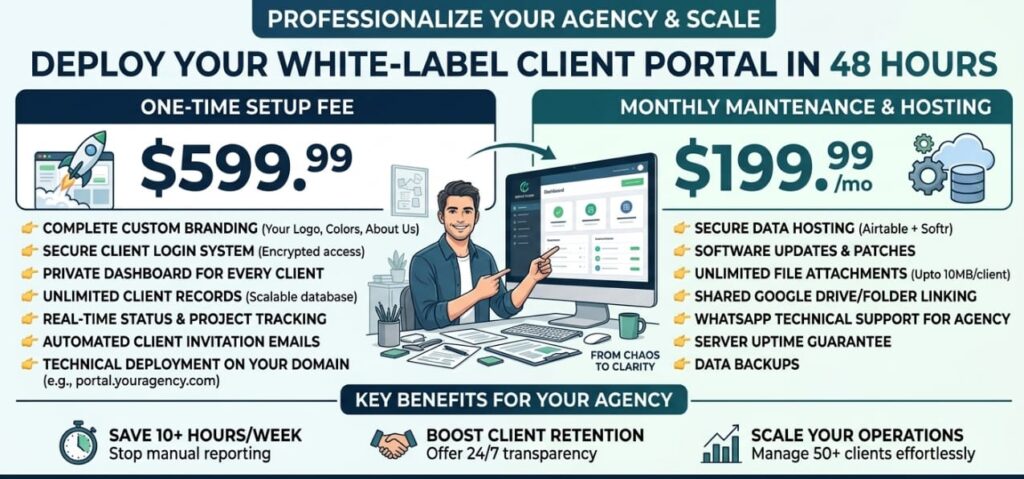 Stop losing trust in messy Slack threads. Give your clients a professional, automated portal custom-built for your brand. Deployed in 48 hours
